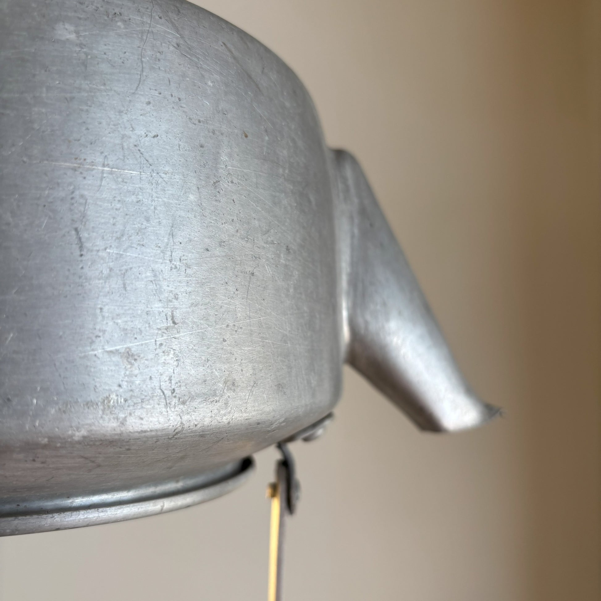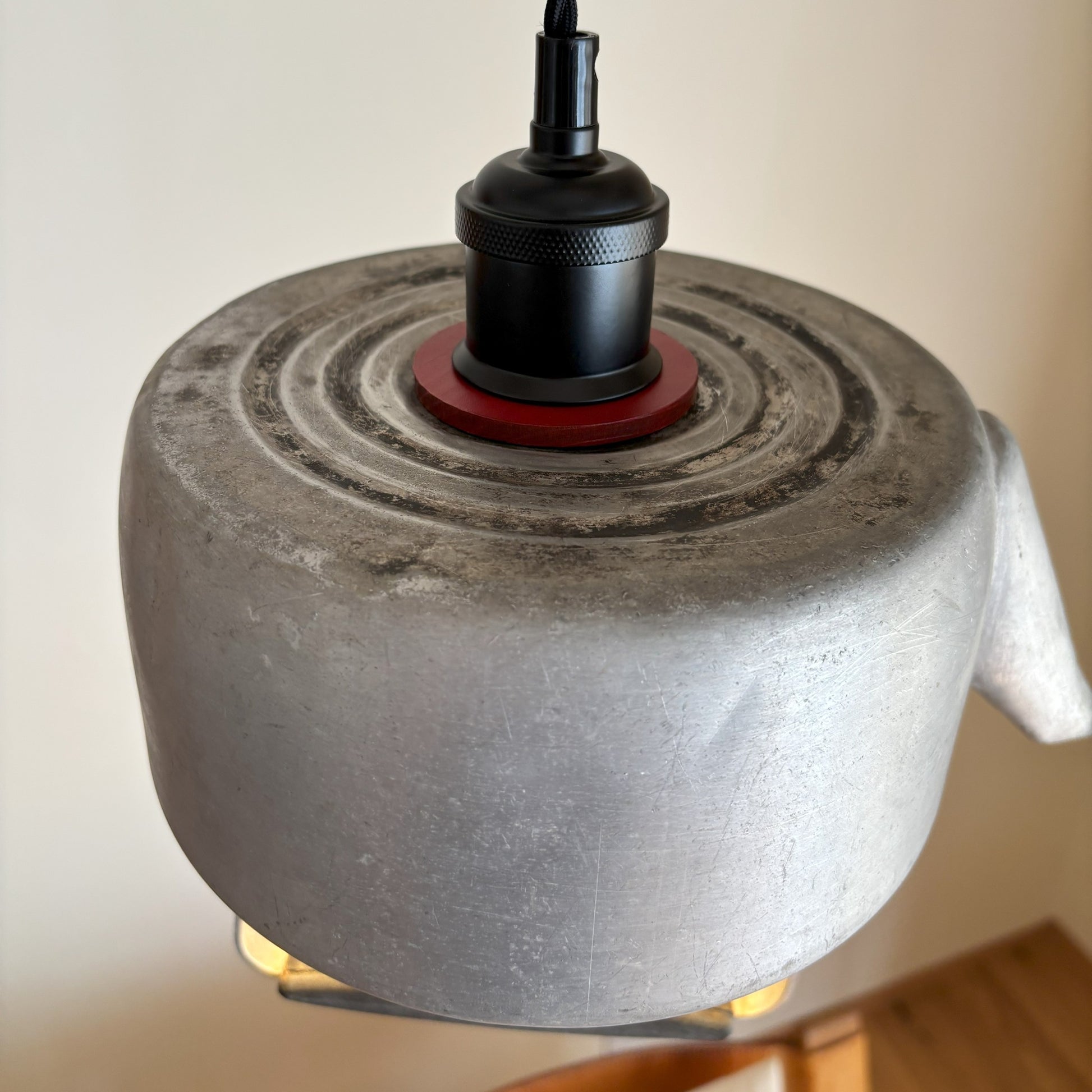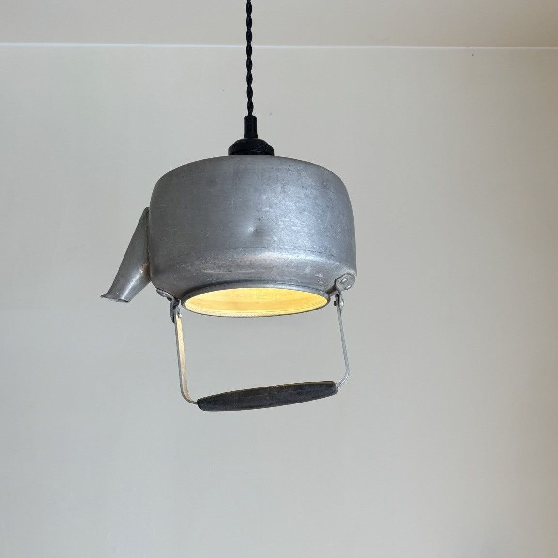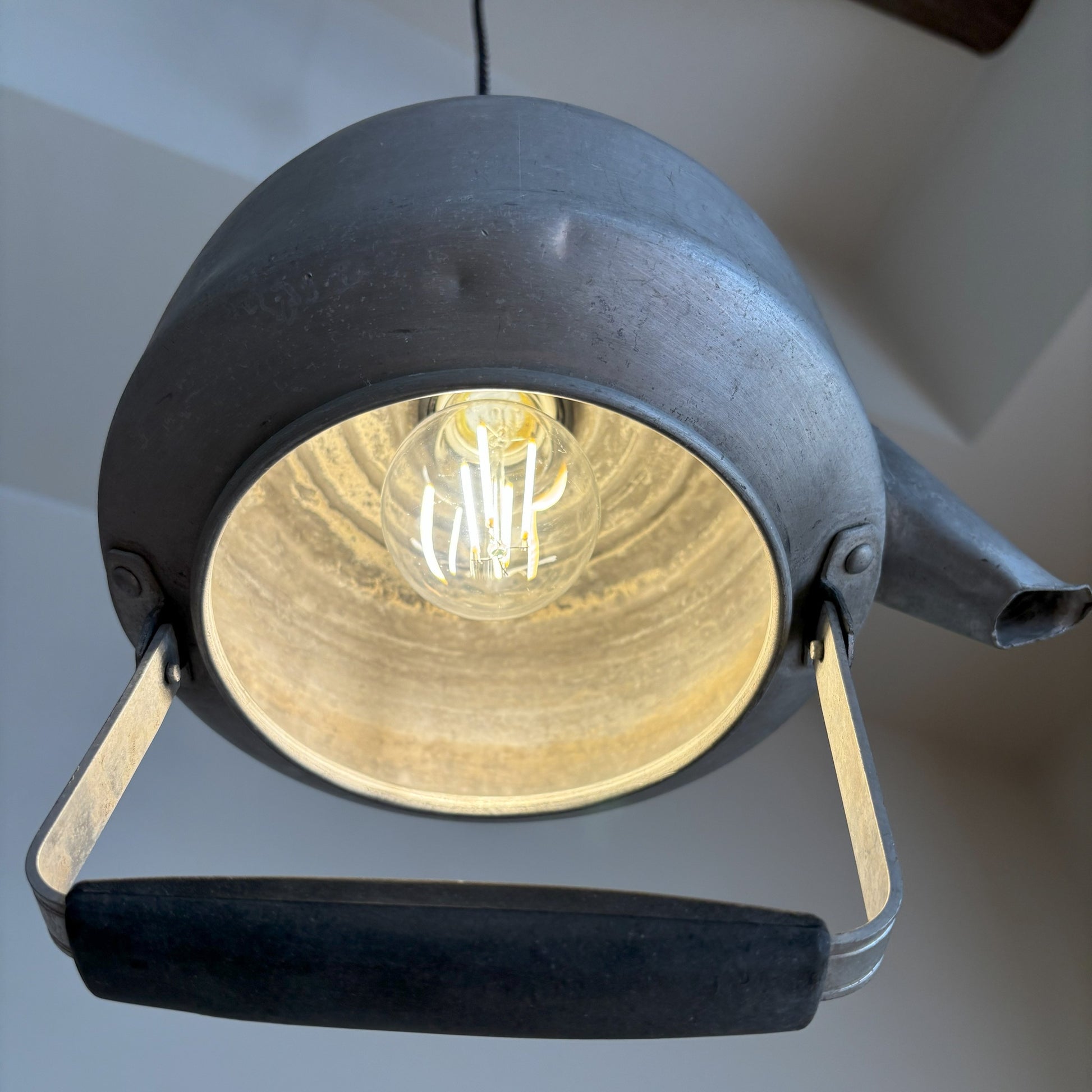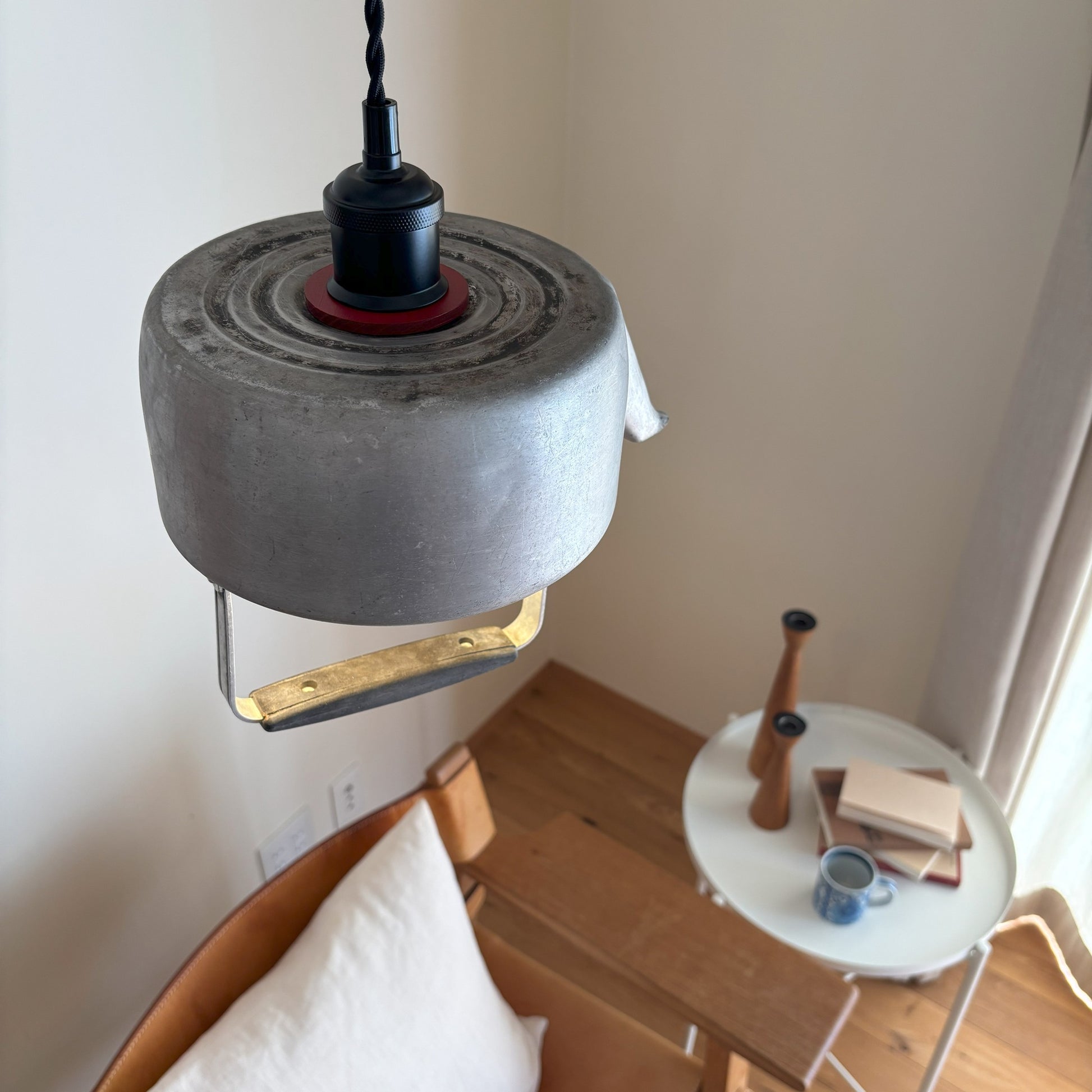 廃材として役目を終えたやかんを、ペンダントライトにリメイクしました。ひとつひとつ異なる質感や小さなキズは、時間を重ねた証。その唯一無二の表情が、あたたかみのある灯りとともに空間にやさしいアクセントを添えます。