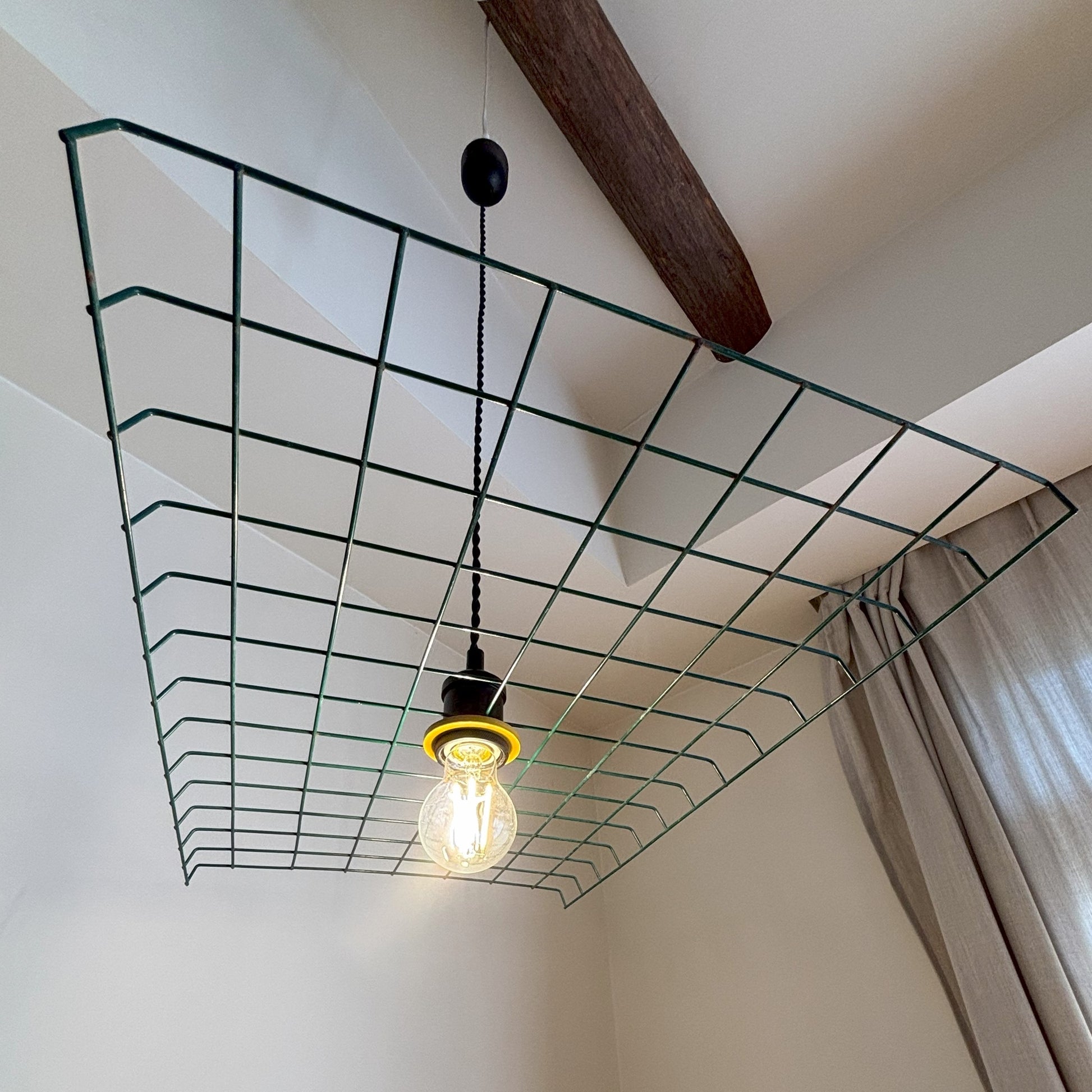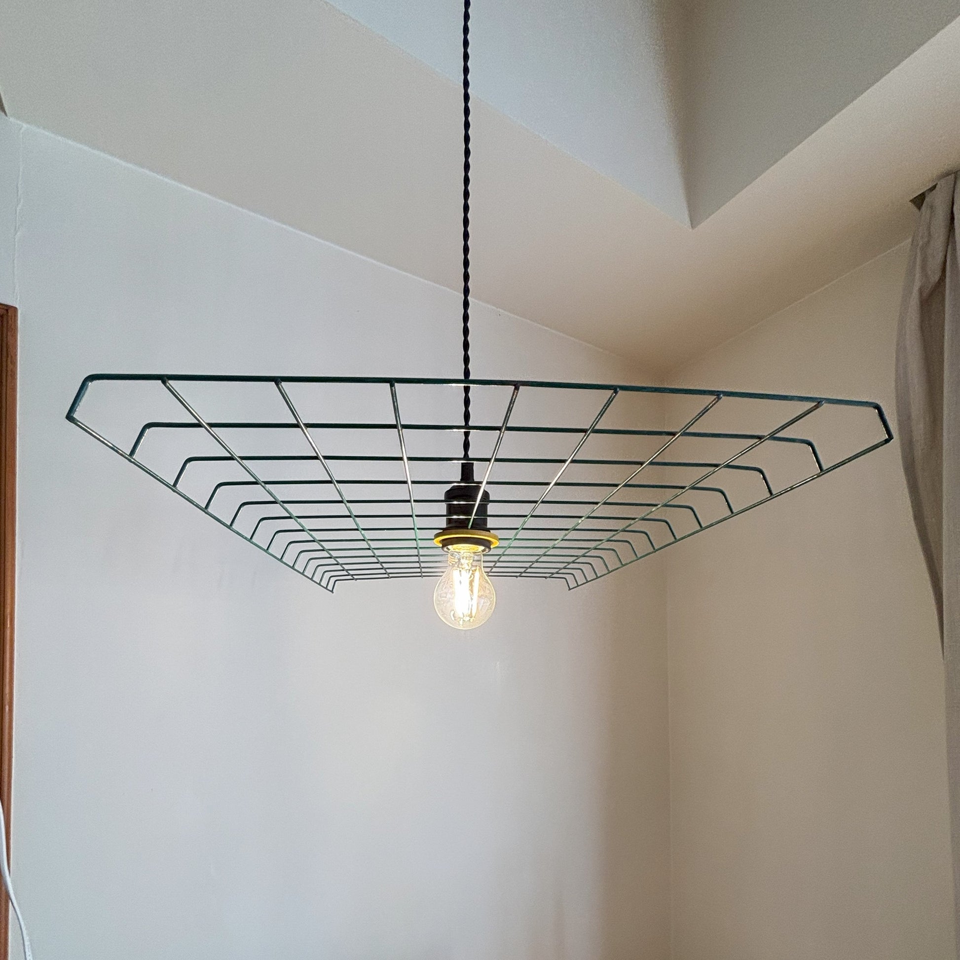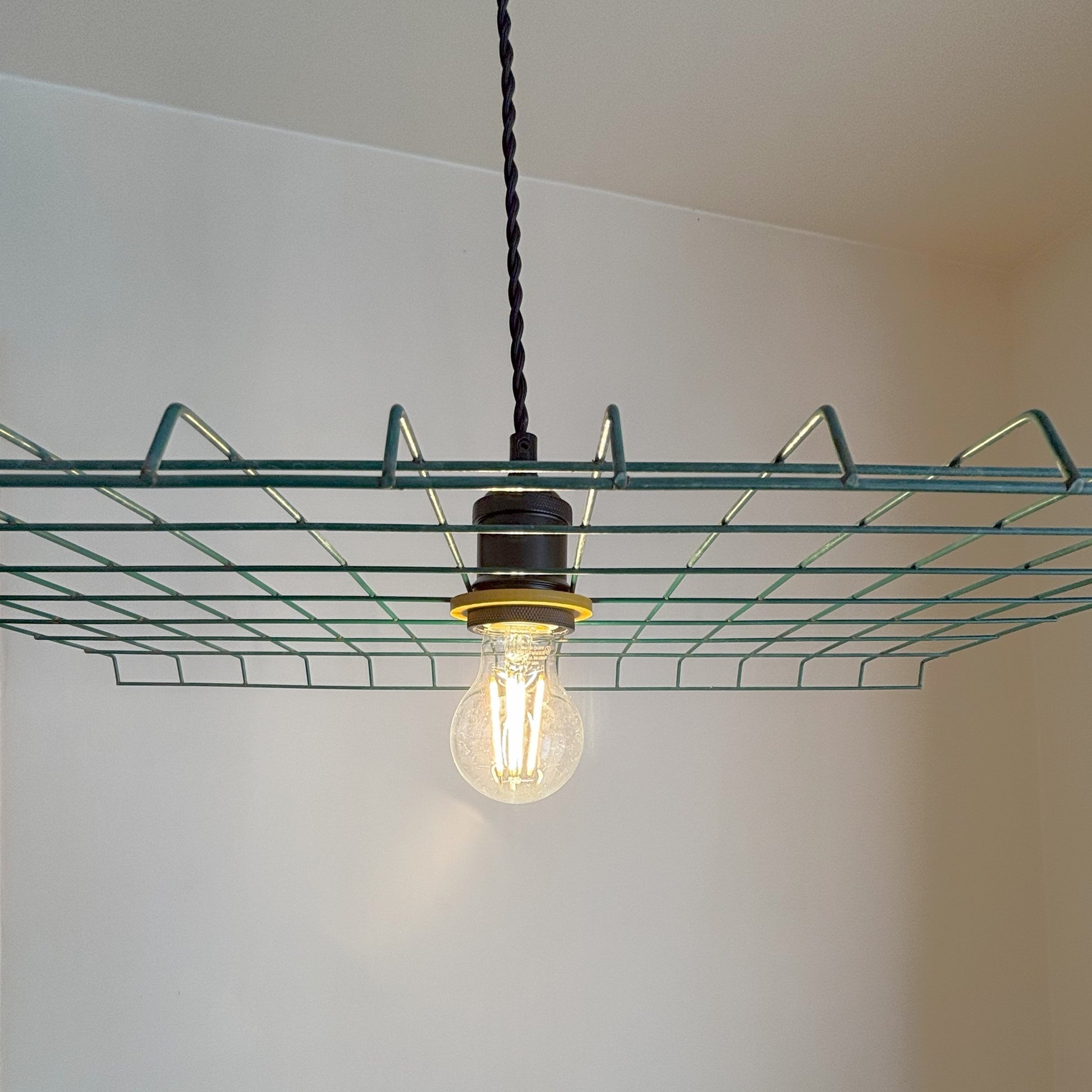 役目を終えた何かの棚板?のようなワイヤーメッシュを、ペンダントライトにリメイクしました。ひとつひとつ異なる質感や小さなキズは、時間を重ねた証。その唯一無二の表情が、あたたかみのある灯りとともに空間にやさしいアクセントを添えます。