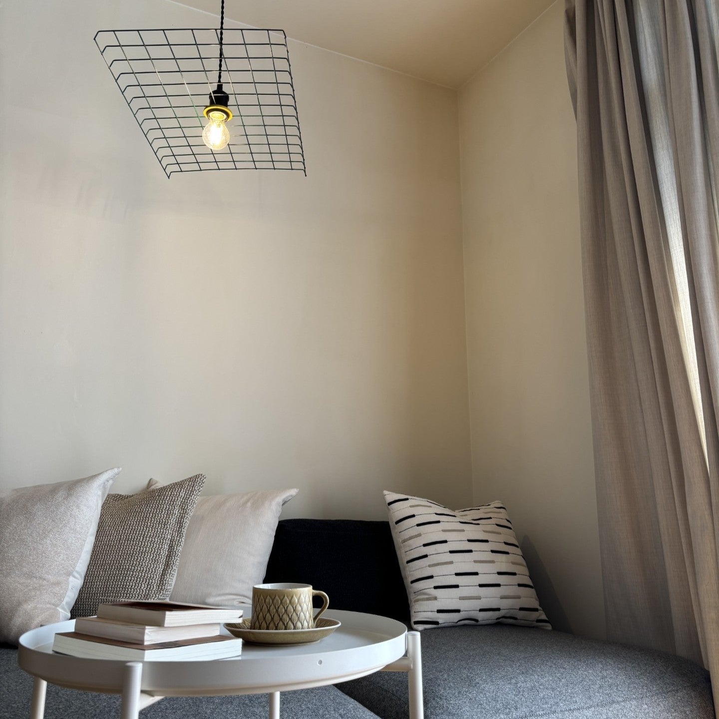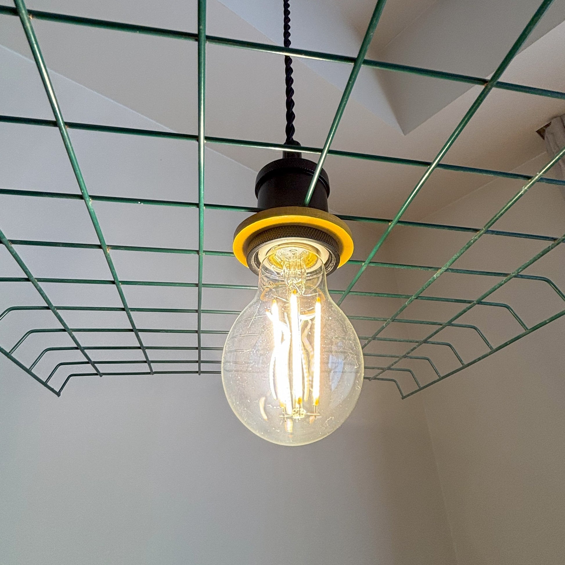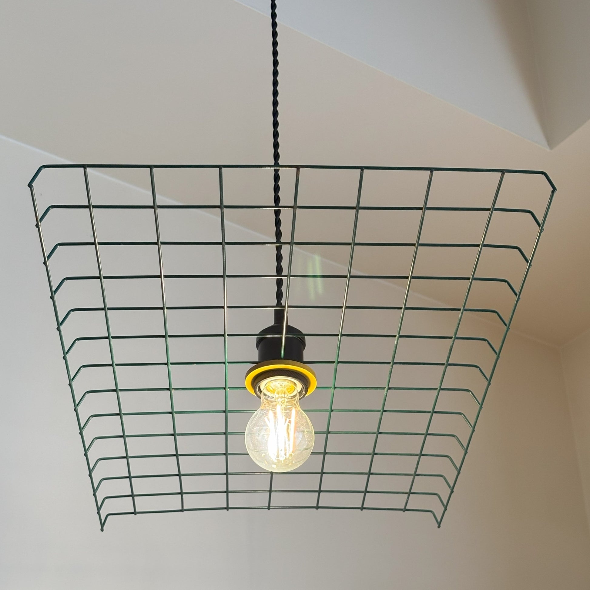 役目を終えた何かの棚板?のようなワイヤーメッシュを、ペンダントライトにリメイクしました。ひとつひとつ異なる質感や小さなキズは、時間を重ねた証。その唯一無二の表情が、あたたかみのある灯りとともに空間にやさしいアクセントを添えます。